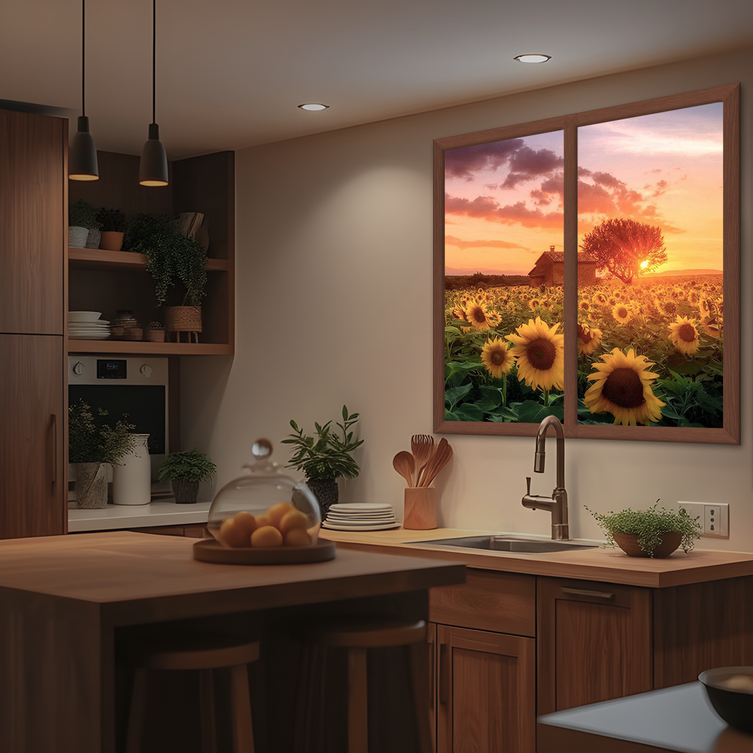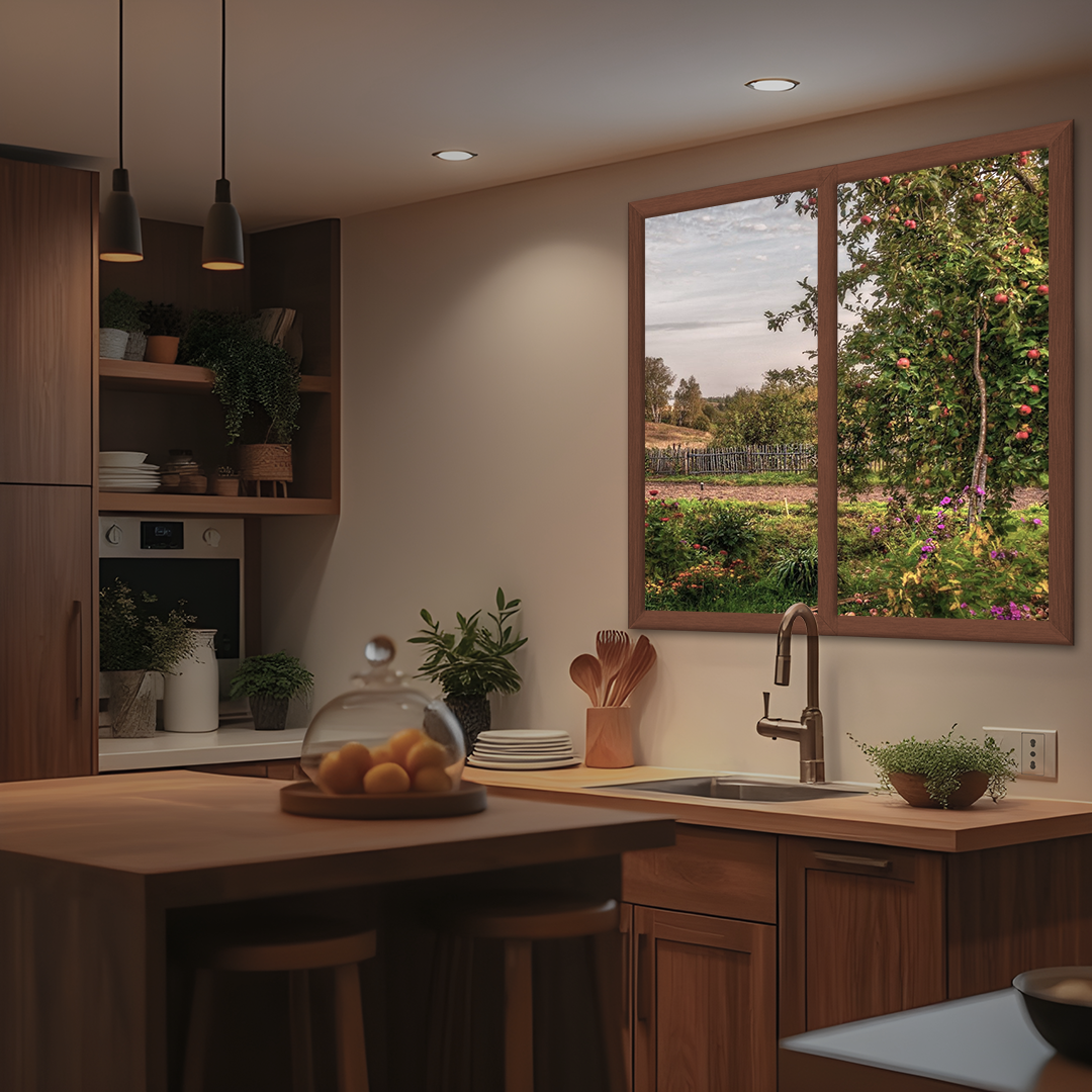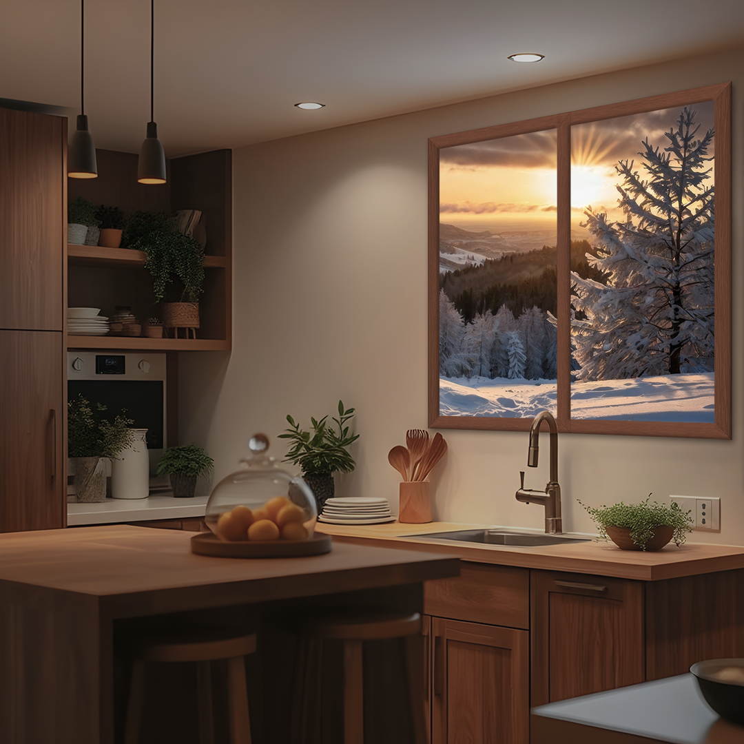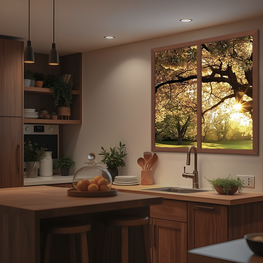 Panourile luminoase LED sunt decorate cu rame din lemn natural + imagine imprimata pe un material special care permite selectiv trecerea luminii pentru un efect realist. Optional se poate atasa un maner decorativ (+30 Lei), completand astfel asemanarea cu o fereastra reala.